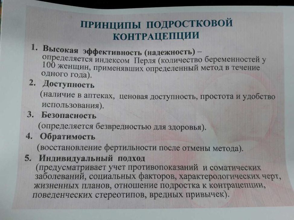 Далее идёт перечисление методов и способов контрацепции, среди которых отдаётся предпочтение оральным гормональным контрацептивам (ОГК). Рекламируются данные противозачаточные средства в разделе «принципы подростковой контрацепции», где, по законам жанра, перечисляются их «достоинства»: