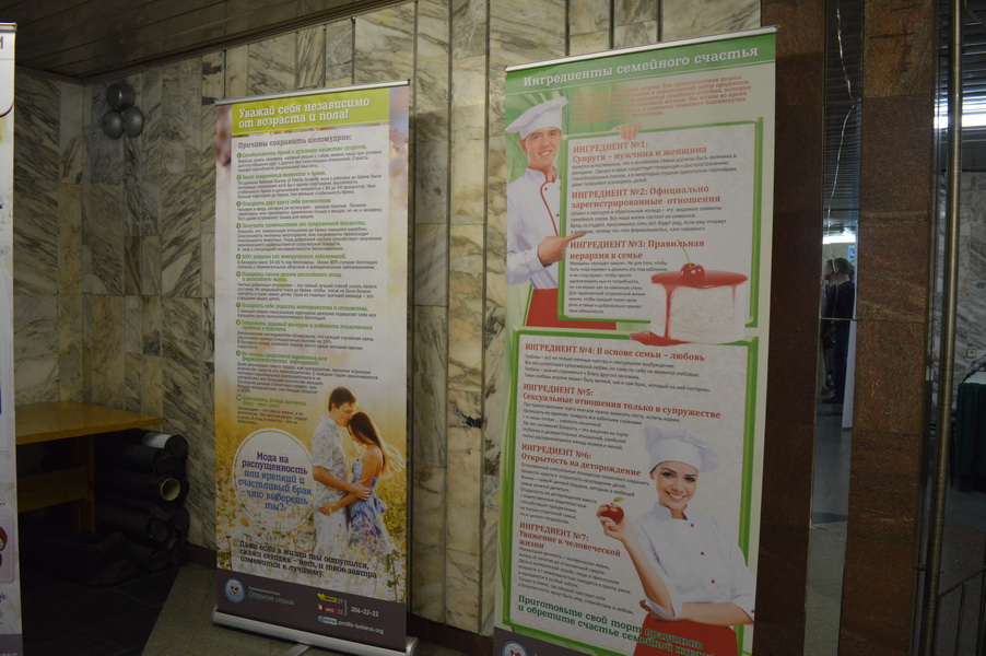Далее идут тематические пары стендов, посвящённых актуальным проблемам современного общества: «секуальная революция» — «причины сохранить целомудрие до брака», «Гражданский брак или пробная семья» — «Ингредиенты семейного счастья», «Отказ от деторождения» — «12 причин родить ещё одного», «Правда о контрацепции» — «Метод распознавания плодности», «Аборт» — «Чудо жизни», «Искусственное оплодотворение» — «Естественные роды», «Гендер: 50 оттенков безумия» — «Библия о супружестве и семье», «Эвтаназия или хорошая смерть» — «Особенные дети – особенный дар», «Феминизм: эмансипация счастья» — «Отцовство».