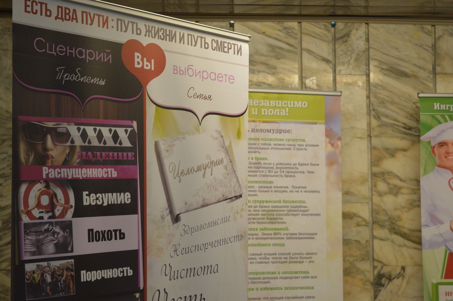 Далее идут тематические пары стендов, посвящённых актуальным проблемам современного общества: «секуальная революция» — «причины сохранить целомудрие до брака», «Гражданский брак или пробная семья» — «Ингредиенты семейного счастья», «Отказ от деторождения» — «12 причин родить ещё одного», «Правда о контрацепции» — «Метод распознавания плодности», «Аборт» — «Чудо жизни», «Искусственное оплодотворение» — «Естественные роды», «Гендер: 50 оттенков безумия» — «Библия о супружестве и семье», «Эвтаназия или хорошая смерть» — «Особенные дети – особенный дар», «Феминизм: эмансипация счастья» — «Отцовство».